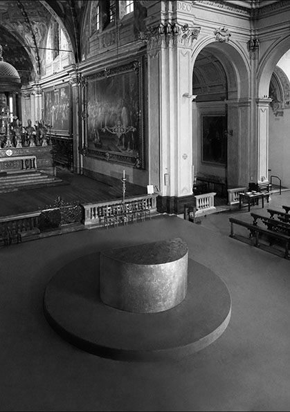 In risposta alla nuova collocazione dei poli liturgici, all’incrocio del transetto con la navata, l’altare mette in corrispondenza quest’area con lo spazio occupato dalla cupola veicolando con questa forma l’idea di una mensa che raccoglie e abbraccia.